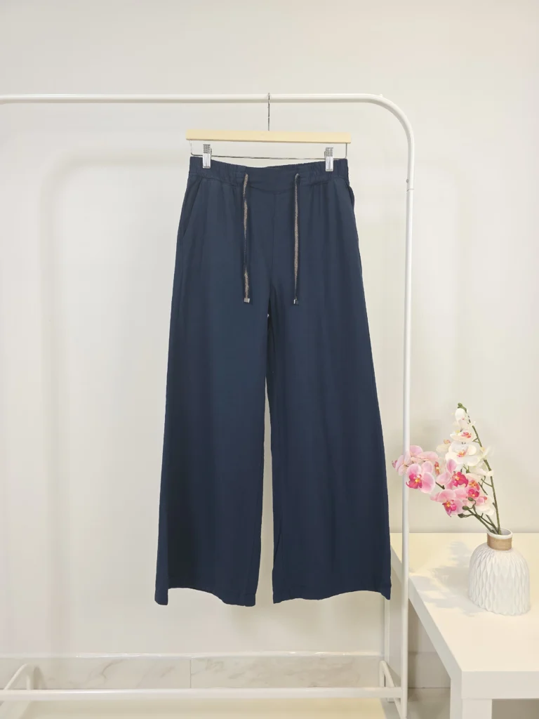 Women’s Wide Cotton Pants in Navy with Drawstring Waist – Turkish Manufacturing