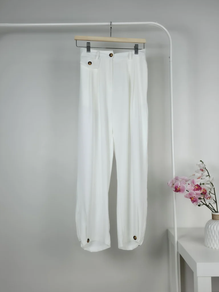 Women’s Elegant White Pants with Wooden-colored Button Details – Turkish Manufacturing