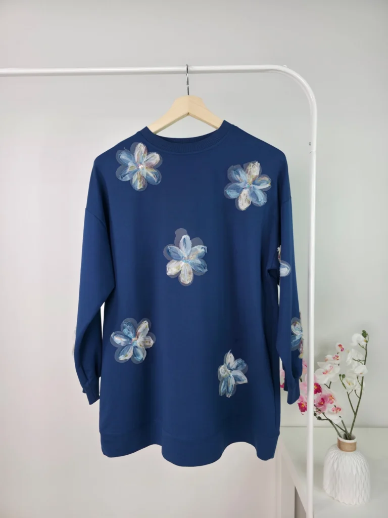 Women’s Long Tunic in Blue with Floral Embellishment – Turkish Manufacturing
