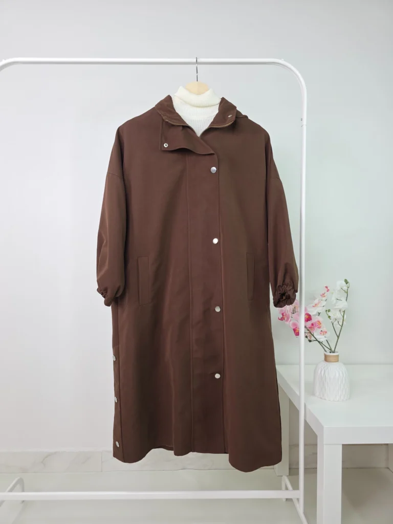 Dark Brown Long Coat with Front Buttons – Elegant Design for Autumn & Winter
