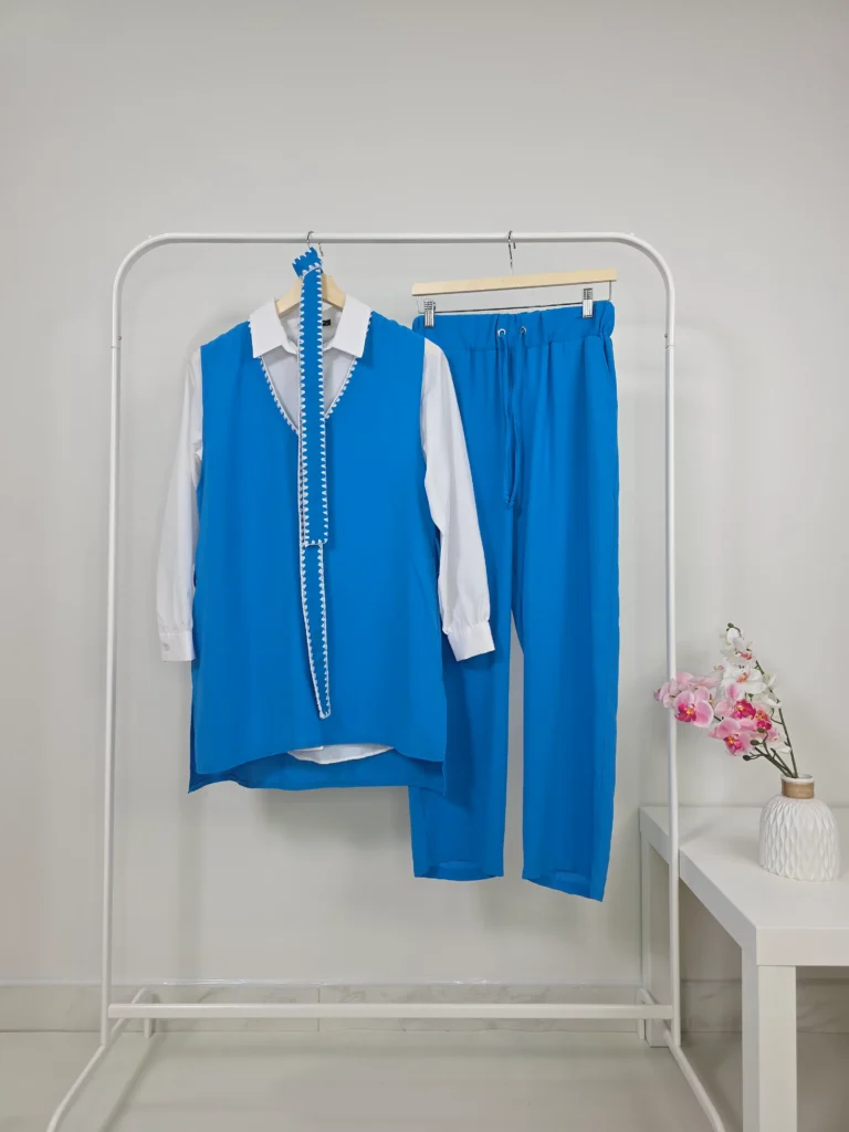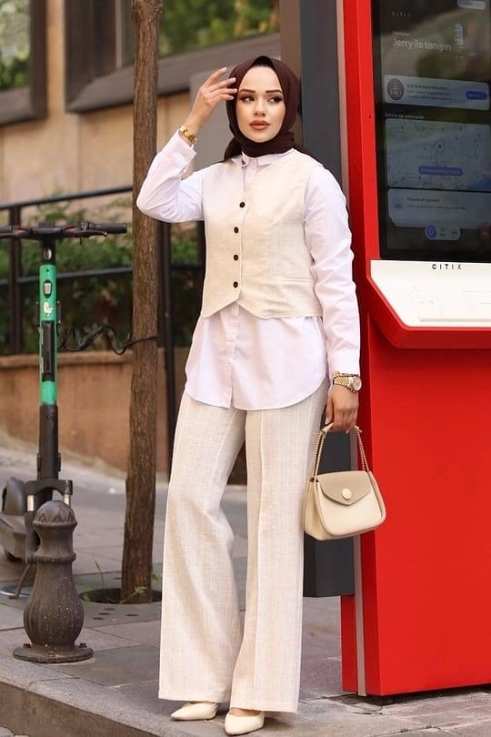 Elegant Beige Set (White Shirt with Vest and Pants) – High-Quality Turkish Manufacturing