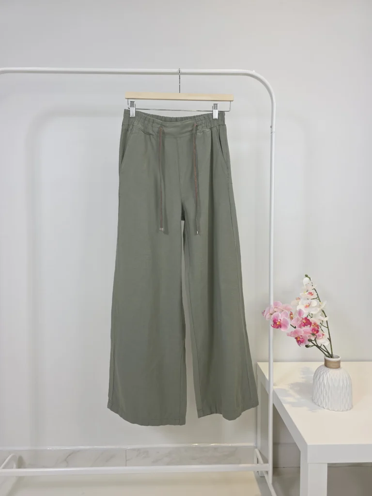 Women’s Wide Cotton Pants in Olive with Drawstring Waist – Turkish Manufacturing