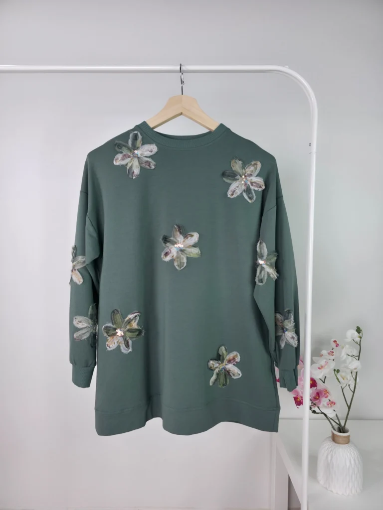 Women’s Long Tunic in Green with Floral Embellishment – Turkish Manufacturing
