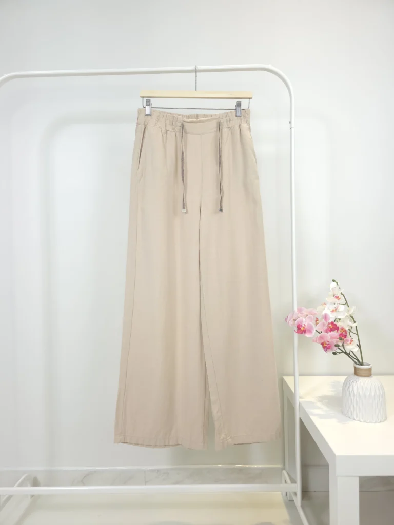 Women’s Wide Cotton Pants in Beige with Drawstring Waist – Turkish Manufacturing