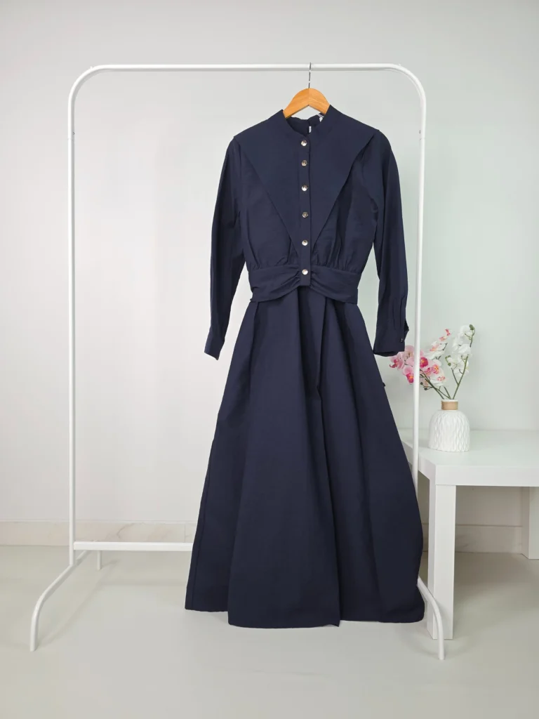 Women’s Long Dress in Dark Navy with Two-Piece Inspired Design – Turkish Manufacturing
